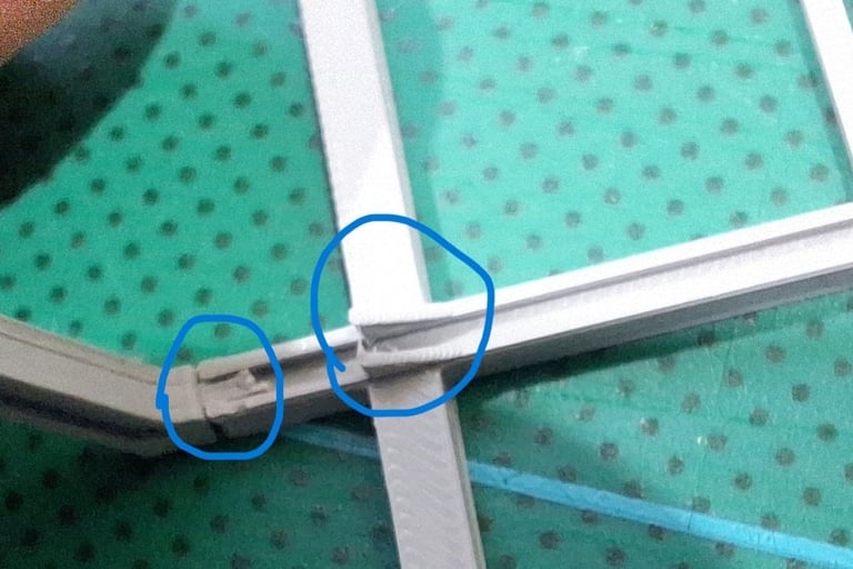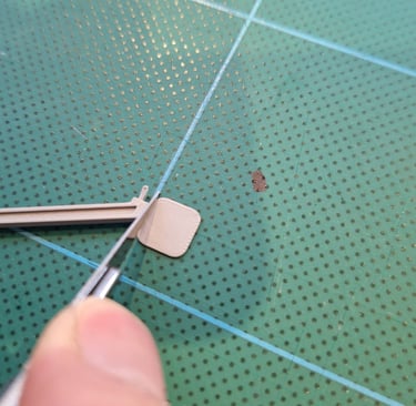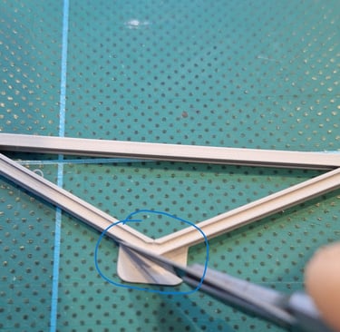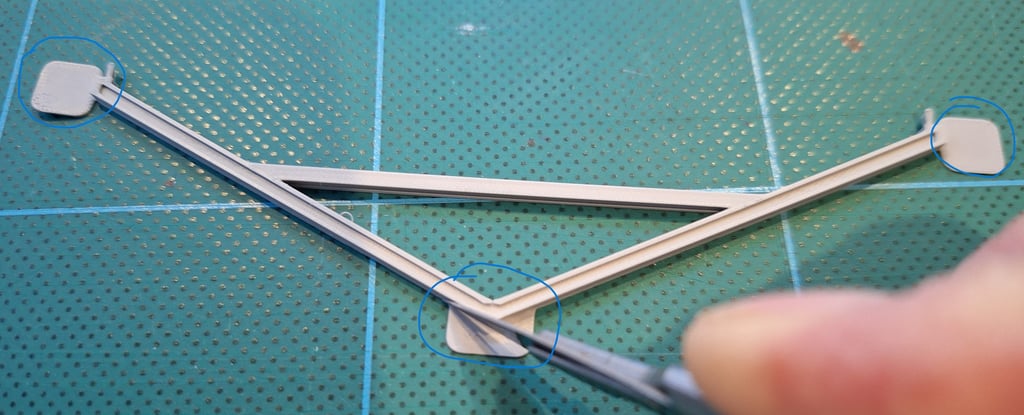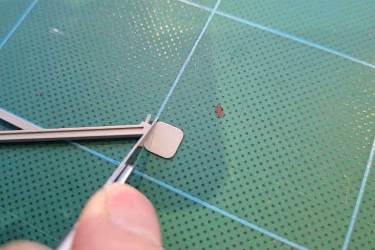 Next, the small tabs on the ends of each truss require trimming such that the tab looks central; using a scalpel just remove a sliver from one side on each tab